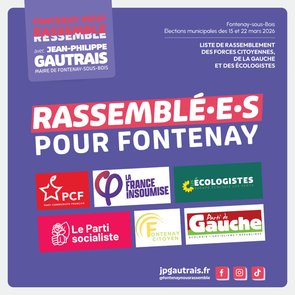 À l’aube de cette nouvelle année et à bientôt deux mois de l’élection municipale du 15 mars 2026, la liste « Fontenay nous rassemble avec Jean-Philippe Gautrais » a le plaisir d’annoncer la constitution d’une union large et solide des forces de gauche. Cette dynamique rassemble le Parti communiste français, Les Écologistes, La France insoumise, le Parti socialiste, Fontenay Citoyen, ainsi que de nombreuses citoyennes et citoyens engagés dans la démarche.