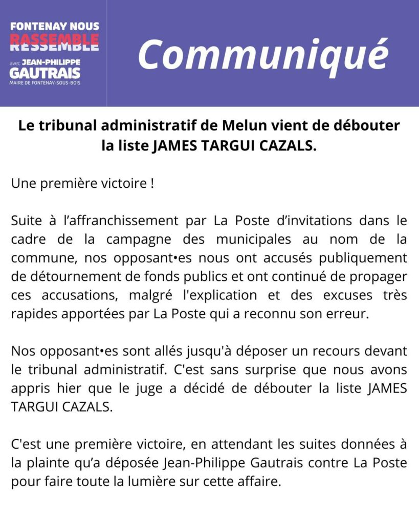 Le tribunal administratif de Melun vient de débouter la liste JAMES TARGUI CAZALS