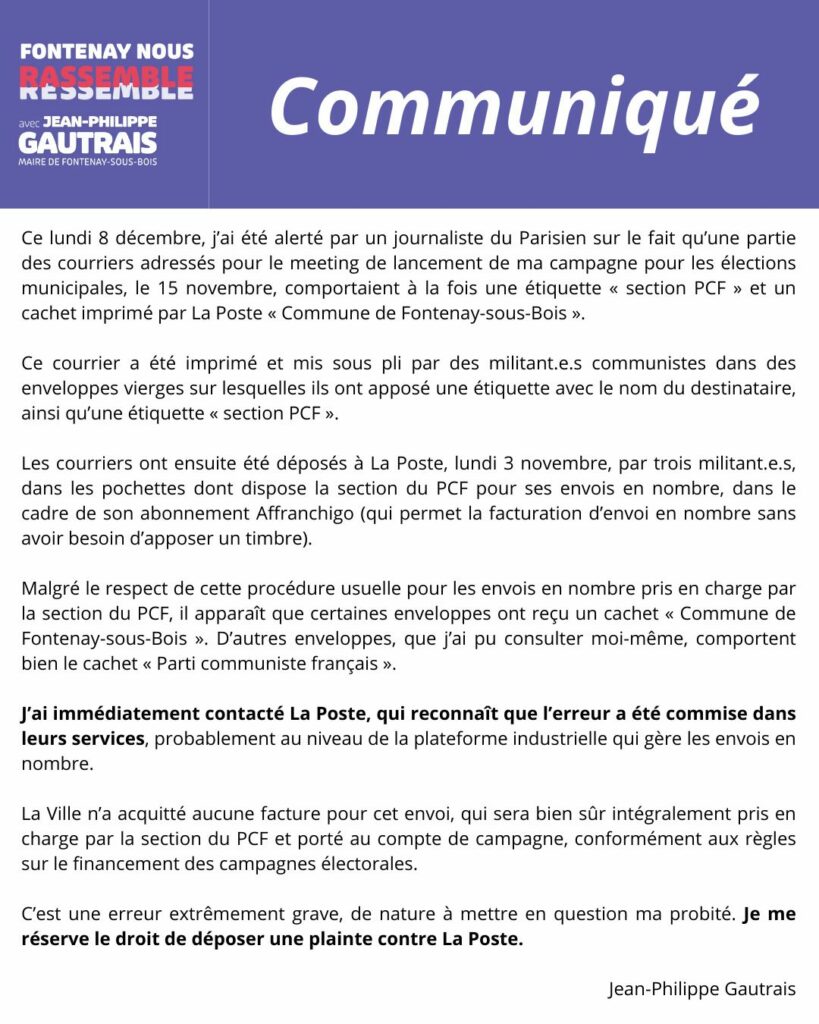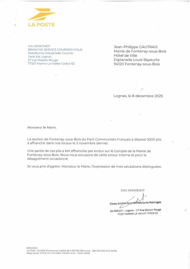 Lundi 8 décembre, alertés par un journaliste du Parisien, nous avons constaté qu’une partie des courriers envoyés pour inviter à notre meeting de lancement de campagne avaient été, par erreur, affectés par La Poste sur le compte de la mairie au lieu de l’être en totalité à la section du PCF (lors d’envois en nombre, c’est La Poste qui réalise l’affranchissement et facture au client concerné le nombre d’envois réalisés).